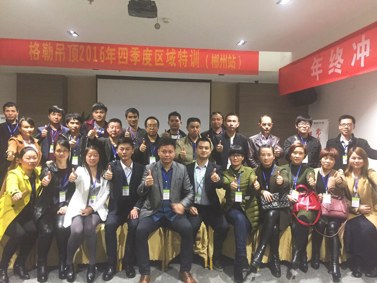 2016年格勒集成吊顶“好店面、新终端”推进会暨四季度区域特训会重庆站刚刚落幕, 11月15号,第四站在钟灵毓秀的福城湖南郴州今悦大酒店拉开序幕,来自湖南、湖北、广西等地区的格勒家人参加了本次培训会,针对公司产品、市场营销、互联网营销等进行了系统的学习。
