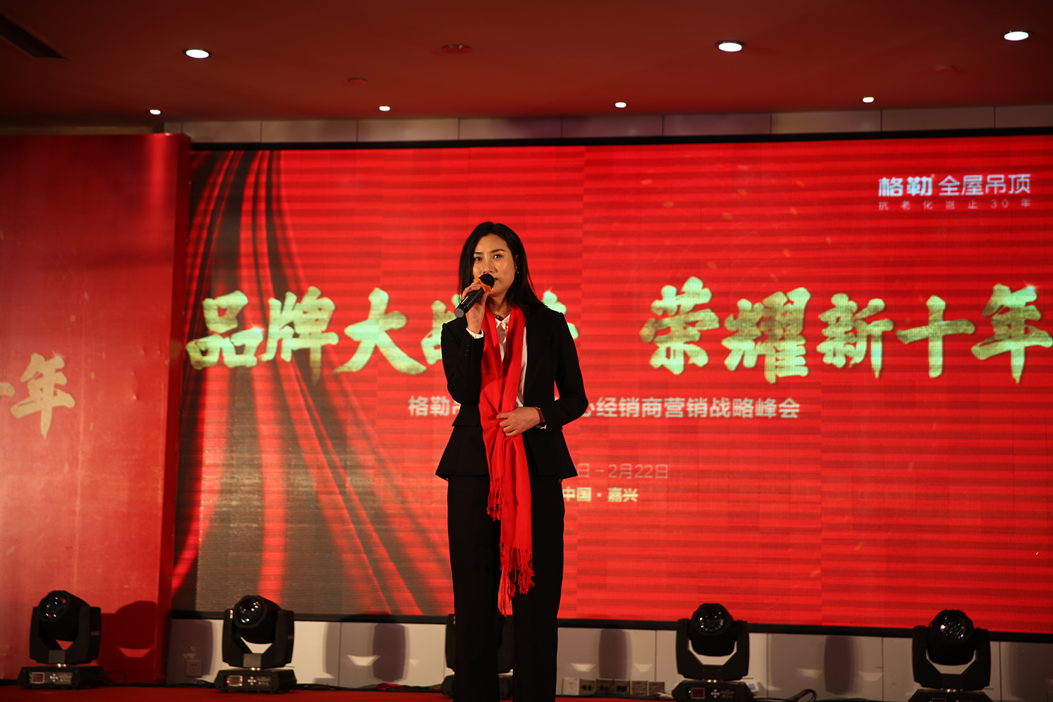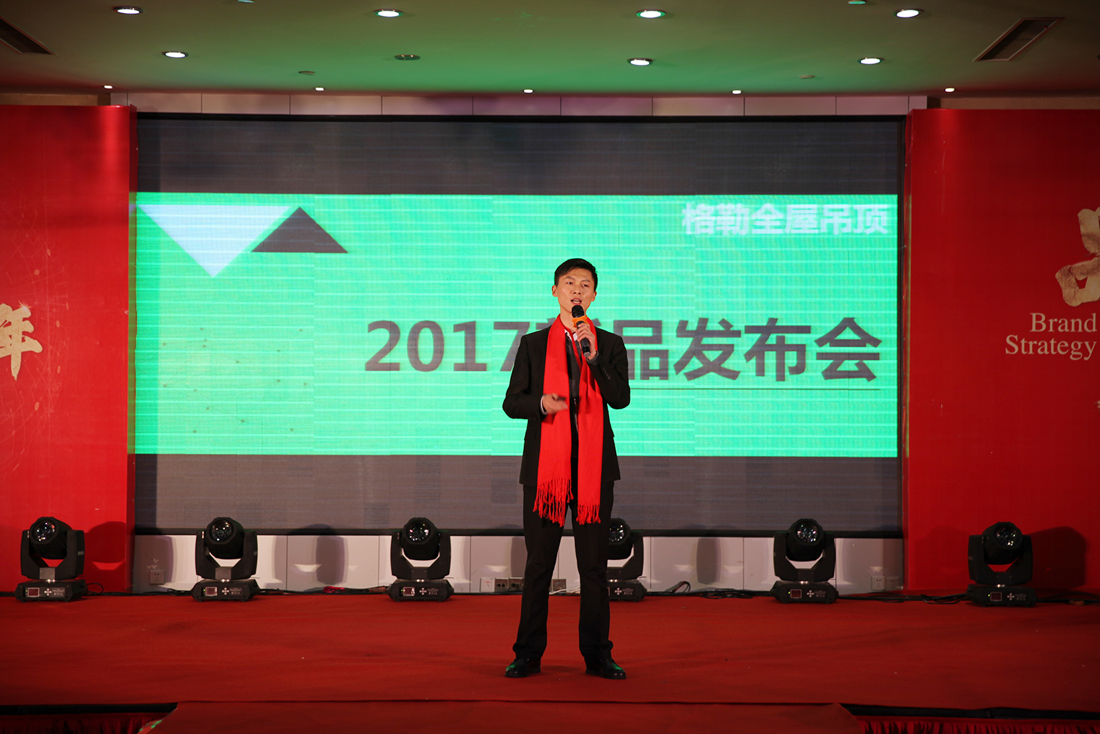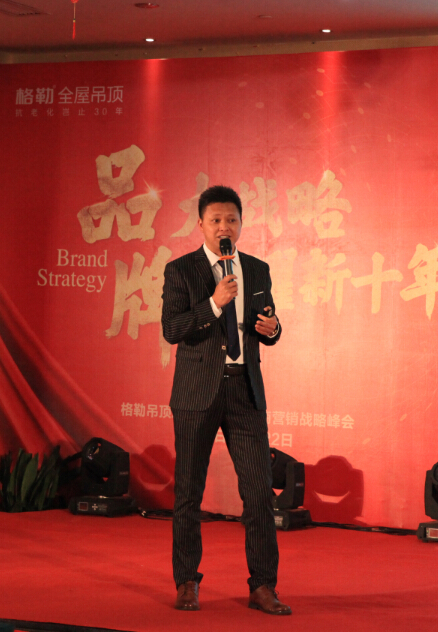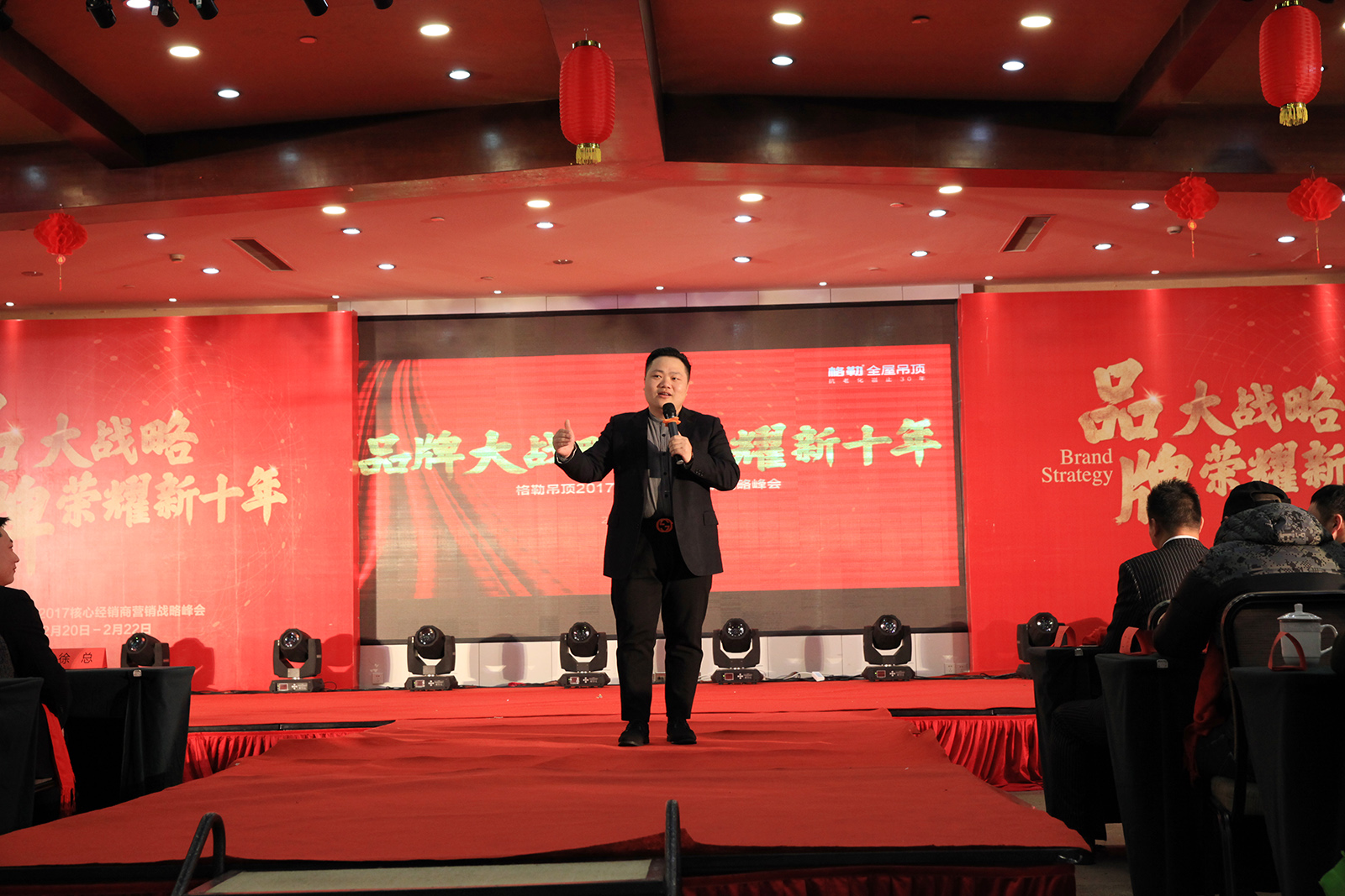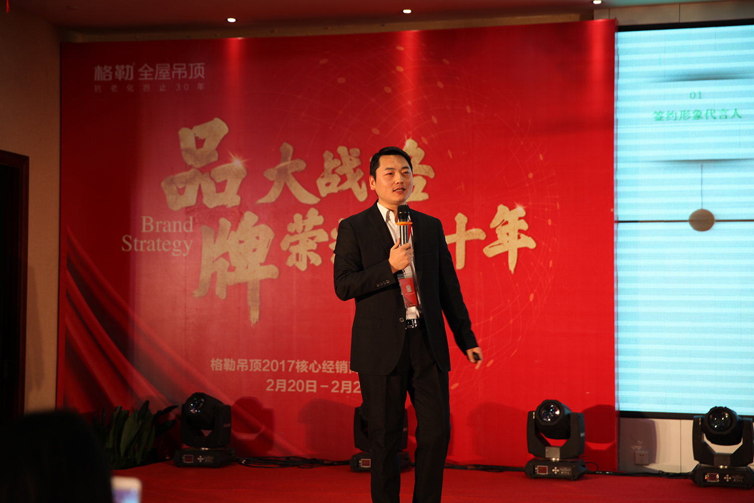 在经销商家人们全部入座后,会议正式开始。格勒全屋吊顶已经发展十年,对于未来十年的发展,又是如何规划的呢?首先,由格勒全屋吊顶总经理徐惠峰先生上台给大家讲述2017年整体战略部署。2017年,是格勒全屋吊顶的“品牌年”,在品牌战略方面有了很多的提升,包括签约形象代言人,终端服务、培训细节的加大,广告语和logo的提升及广告全方位覆盖,新增网点500家,电器产品“质”的飞跃等等,正式开启格勒全屋吊顶“品牌大战略”。