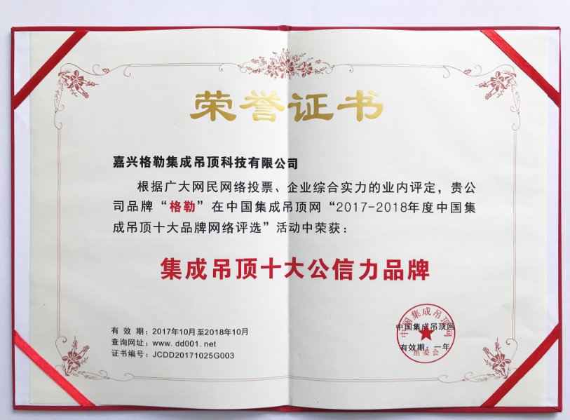 助力品牌强国战略,打造更多享誉世界的“中国品牌”,推动中国经济发展进入质量时代,2017年10月25日,集成吊顶行业大佬齐聚嘉兴晶晖酒店,颁奖典礼上,格勒全屋吊顶凭借优质的产品、专业的精英团队和卓越的行业贡献等多个维度的综合实力,在层层选拔中脱颖而出,荣膺“集成吊顶十大公信力品牌”。